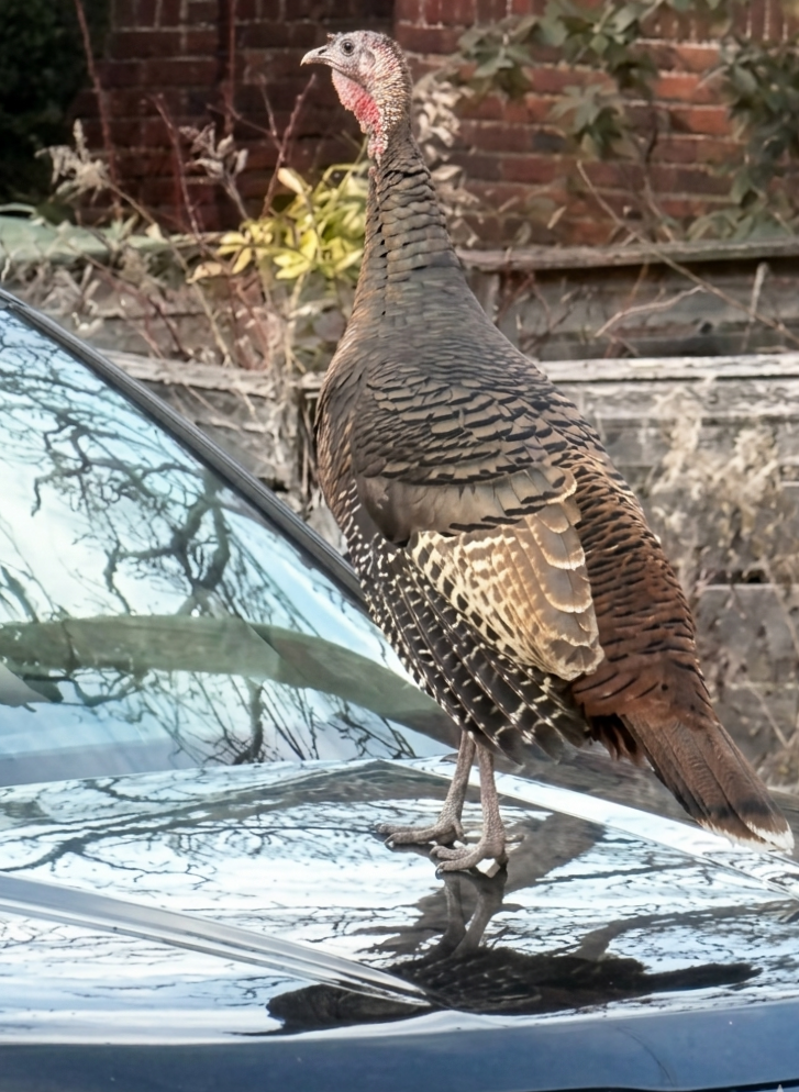 Similarly, by the time the turkey figured out that the perceived threat was in fact his own reflection and gave up his determined battle, the gaggle of turkeys he roamed the neighborhood with had left him far, far behind. Finally turning his attention away from his own reflection, the turkey saw that he was all alone, looking frankly slightly foolish. He hopped down and began running frantically in search of his flock*.